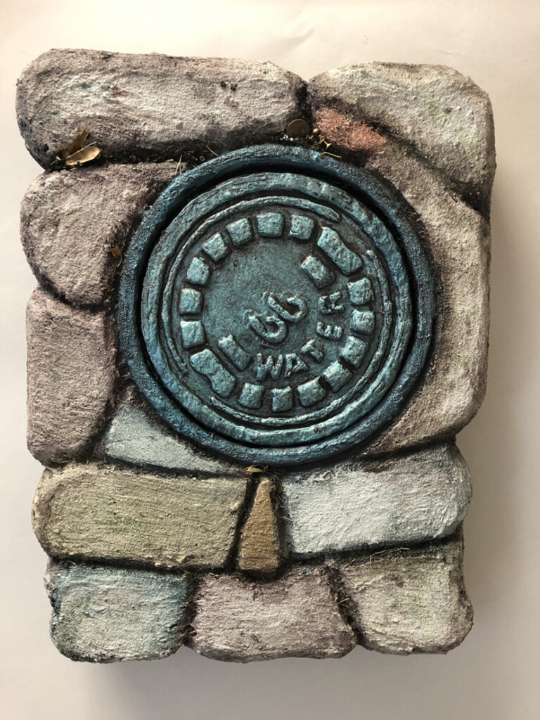 Three cast paper water covers on a textured background. $290 SOLD